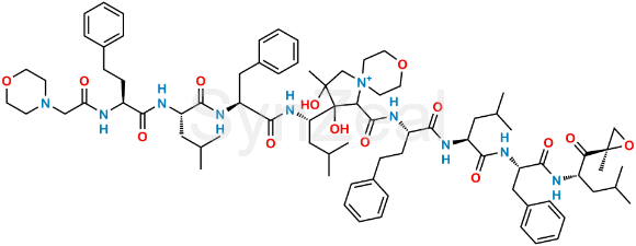 Carfilzomib Dimer Impurity 4 is chemically 2-((4S,7S,10S,13S)-10-benzyl-7-isobutyl-15-methyl-1-morpholino-2,5,8,11-tetraoxo-4-phenethyl-3,6,9,12-tetraazahexadecan-13-yl)-2,3-dihydroxy-3-methyl-1-(((S)-1-(((S)-4-methyl-1-(((S)-1-(((S)-4-methyl-1-((R)-2-methyloxiran-2-yl)-1-oxopentan-2-yl)amino)-1-oxo-3-phenylpropan-2-yl)amino)-1-oxopentan-2-yl)amino)-1-oxo-4-phenylbutan-2-yl)carbamoyl)-8-oxa-5-azaspiro[4.5]decan-5-ium. Carfilzomib Dimer Impurity 4 is supplied with detailed characterization data compliant with regulatory guideline. Carfilzomib Dimer Impurity 4 can be used for the analytical method development, method validation (AMV), Quality Controlled (QC) application for Abbreviated New Drug Application (ANDA) or during commercial production of Carfilzomib.