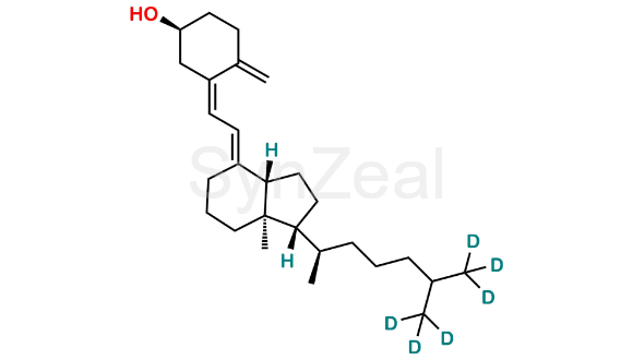 Cholecalciferol D6 (Vitamin D3 D6) is chemically (S,Z)-3-(2-((1R,3aS,7aR,E)-7a-Methyl-1-((R)-6-(methyl-d3)heptan-2-yl-7,7,7-d3)octahydro-4H-inden-4-ylidene)ethylidene)-4-methylenecyclohexan-1-ol. Cholecalciferol D6 (Vitamin D3 D6) is supplied with detailed characterization data compliant with regulatory guideline. Cholecalciferol D6 (Vitamin D3 D6) can be used for the analytical method development, method validation (AMV), Quality Controlled (QC) application for Abbreviated New Drug Application (ANDA) or during commercial production of Cholecalciferol.