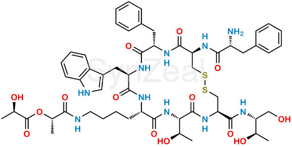 D-Lactolactoyl-Lys-Octreotide is chemically (S)-1-((4-((4R,7S,10S,13R,16S,19R)-13-((1H-indol-3-yl)methyl)-19-((R)-2-amino-3-phenylpropanamido)-16-benzyl-4-(((2R,3R)-1,3-dihydroxybutan-2-yl)carbamoyl)-7-((R)-1-hydroxyethyl)-6,9,12,15,18-pentaoxo-1,2-dithia-5,8,11,14,17-pentaazacycloicosan-10-yl)butyl)amino)-1-oxopropan-2-yl (R)-2-hydroxypropanoate. D-Lactolactoyl-Lys-Octreotide is supplied with detailed characterization data compliant with regulatory guideline. D-Lactolactoyl-Lys-Octreotide can be used for the analytical method development, method validation (AMV), Quality Controlled (QC) application for Abbreviated New Drug Application (ANDA) or during commercial production of Octreotide.