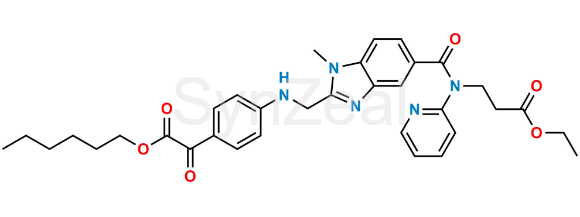Dabigatran Impurity 67 is chemically Ethyl 3-(2-(((4-(2-(hexyloxy)-2-oxoacetyl)phenyl)amino)methyl)-1-methyl-N-(pyridin-2-yl)-1H-benzo[d]imidazole-5-carboxamido)propanoate. Dabigatran Impurity 67 is supplied with detailed characterization data compliant with regulatory guideline. Dabigatran Impurity 67 can be used for the analytical method development, method validation (AMV), Quality Controlled (QC) application for Abbreviated New Drug Application (ANDA) or during commercial production of Dabigatran.