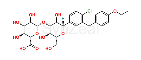 Dapagliflozin 3-O-β-D-glucuronide is chemically (2S,3S,4S,5R,6R)-6-(((2S,3S,4R,5R,6R)-2-(4-chloro-3-(4-ethoxybenzyl)phenyl)-3,5-dihydroxy-6-(hydroxymethyl)tetrahydro-2H-pyran-4-yl)oxy)-3,4,5-trihydroxytetrahydro-2H-pyran-2-carboxylic acid. Dapagliflozin 3-O-β-D-glucuronide is supplied with detailed characterization data compliant with regulatory guideline. Dapagliflozin 3-O-β-D-glucuronide can be used for the analytical method development, method validation (AMV), Quality Controlled (QC) application for Abbreviated New Drug Application (ANDA) or during commercial production of Dapagliflozin.