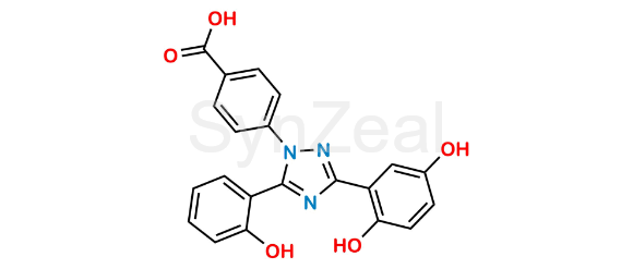 Deferasirox Impurity 4 is chemically 4-(3-(2,5-Dihydroxyphenyl)-5-(2-hydroxyphenyl)-1H-1,2,4-triazol-1-yl)benzoic acid. Deferasirox Impurity 4 is supplied with detailed characterization data compliant with regulatory guideline. Deferasirox Impurity 4 can be used for the analytical method development, method validation (AMV), Quality Controlled (QC) application for Abbreviated New Drug Application (ANDA) or during commercial production of Deferasirox.