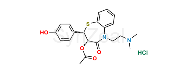 Diltiazem EP Impurity C is chemically (2S,3S)-5-[2-(dimethylamino)ethyl]-2-(4-hydroxyphenyl)-4-oxo-2,3,4,5-tetrahydro-1,5-benzothiazepin-3-yl acetate hydrochloride (as per EP & USP). It is also known as Diltiazem USP Related Compound C ; O-Desmethyl Diltiazem HCl. Diltiazem EP Impurity C is supplied with detailed characterization data compliant with regulatory guideline. Diltiazem EP Impurity C can be used for the analytical method development, method validation (AMV), Quality Controlled (QC) application for Abbreviated New Drug Application (ANDA) or during commercial production of Diltiazem.