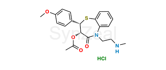 Diltiazem EP Impurity D is chemically (2S,3S)-2-(4-methoxyphenyl)-5-[2-(methylamino)ethyl]-4-oxo-2,3,4,5-tetrahydro-1,5-benzothiazepin-3-yl acetate hydrochloride (as per EP & USP). It is also known as Diltiazem USP Related Compound D ; N-Desmethyl Diltiazem Hydrochloride . Diltiazem EP Impurity D is supplied with detailed characterization data compliant with regulatory guideline. Diltiazem EP Impurity D can be used for the analytical method development, method validation (AMV), Quality Controlled (QC) application for Abbreviated New Drug Application (ANDA) or during commercial production of Diltiazem.
