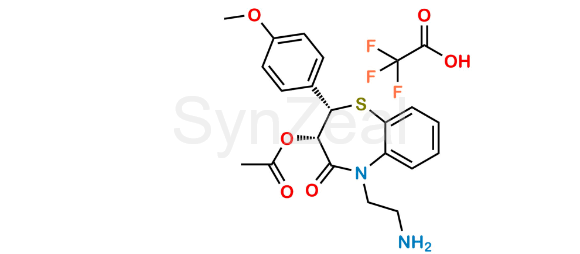 Diltiazem N,N-DiDesmethyl TFA Salt is chemically (2S,3S)-5-(2-Aminoethyl)-2-(4-methoxyphenyl)-4-oxo-2,3,4,5-tetrahydrobenzo[b][1,4]thiazepin-3-yl acetate 2,2,2-trifluoroacetate. Diltiazem N,N-DiDesmethyl TFA Salt is supplied with detailed characterization data compliant with regulatory guideline. Diltiazem N,N-DiDesmethyl TFA Salt can be used for the analytical method development, method validation (AMV), Quality Controlled (QC) application for Abbreviated New Drug Application (ANDA) or during commercial production of Diltiazem.