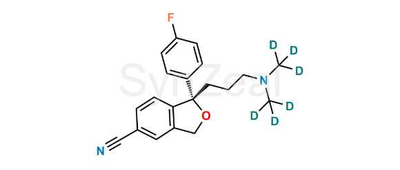 Escitalopram-D6 is chemically (S)-1-(3-(bis(methyl-d3)amino)propyl)-1-(4-fluorophenyl)-1,3-dihydroisobenzofuran-5-carbonitrile. Escitalopram-D6 is supplied with detailed characterization data compliant with regulatory guideline. Escitalopram-D6 can be used for the analytical method development, method validation (AMV), Quality Controlled (QC) application for Abbreviated New Drug Application (ANDA) or during commercial production of Escitalopram.