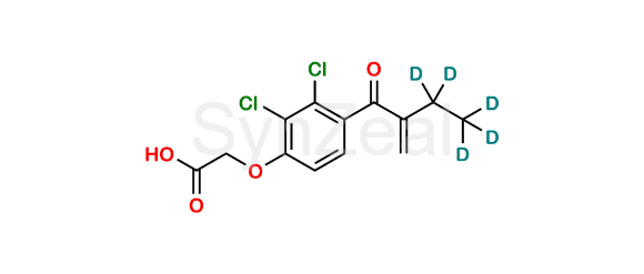 Ethacrynic Acid D5 is chemically 2-(2,3-Dichloro-4-(2-methylenebutanoyl-3,3,4,4,4-d5)phenoxy)acetic acid. Ethacrynic Acid D5 is supplied with detailed characterization data compliant with regulatory guideline. Ethacrynic Acid D5 can be used for the analytical method development, method validation (AMV), Quality Controlled (QC) application for Abbreviated New Drug Application (ANDA) or during commercial production of Ethacrynic Acid.