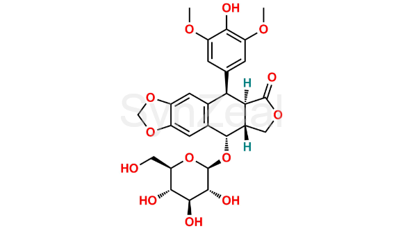 Etoposide EP Impurity D is chemically (5R,5aR,8aR,9S)-9-(b-d-Glucopyranosyloxy)-5-(4-hydroxy-3,5-dimethoxyphenyl)-5,8,8a,9-tetrahydro[2]benzofuro-[5,6-f][1,3]benzodioxol-6(5aH)-one (lignan P) (as per EP) ; (5R,5aR,8aR,9S)-9-(beta-D-glucopyranosyloxy)-5-(4-hydroxy-3,5-dimethoxy phenyl) -5,8,8a,9 -tetrahydro[2]benzofuro-[5,6-f][1,3]benzodioxol-6(5aH)-one (as per USP). It is also known as lignan P (EP & USP). Etoposide EP Impurity D is supplied with detailed characterization data compliant with regulatory guideline. Etoposide EP Impurity D can be used for the analytical method development, method validation (AMV), Quality Controlled (QC) application for Abbreviated New Drug Application (ANDA) or during commercial production of Etoposide.