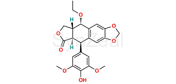 Etoposide EP Impurity H is chemically (5R,5aR,8aR,9S)-9-Ethoxy-5-(4-hydroxy-3,5-dimethoxyphenyl)-5,8,8a,9-tetrahydro[2]benzofuro[5,6-f][1,3]benzodioxol-6(5aH)-one (as per EP). It is also known as 4′-O-desmethyl-1-O-ethylepipodophyllotoxin (EP). Etoposide EP Impurity H is supplied with detailed characterization data compliant with regulatory guideline. Etoposide EP Impurity H can be used for the analytical method development, method validation (AMV), Quality Controlled (QC) application for Abbreviated New Drug Application (ANDA) or during commercial production of Etoposide.