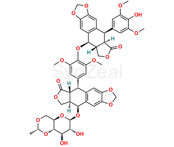 Etoposide EP Impurity R is chemically (5R,5aR,8aR,9S)-9-[[4,6-O-[(1R)-Ethane-1,1-diyl]-b-D-glucopyranosyl]oxy]-5-[4-[[(5R,5aR,8aR,9R)-5-(4-hydroxy-3,5-dimethoxyphenyl)-6-oxo-5,5a,6,8,8a,9-hexahydro[2]benzofuro[5,6-f][1,3]benzodioxol-9-yl]oxy]-3,5-dimethoxyphenyl]-5,8,8a,9-tetrahydro[2]benzofuro[5,6-f][1,3]benzodioxol-6(5aH)-one (as per EP). Etoposide EP Impurity R is supplied with detailed characterization data compliant with regulatory guideline. Etoposide EP Impurity R can be used for the analytical method development, method validation (AMV), Quality Controlled (QC) application for Abbreviated New Drug Application (ANDA) or during commercial production of Etoposide.