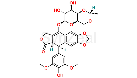 Etoposide Impurity 4 is chemically (5R,5aR)-9-(((2R,4aR,6S,7R,8R,8aS)-7,8-Dihydroxy-2-methylhexahydropyrano[3,2-d][1,3]dioxin-6-yl)oxy)-5-(4-hydroxy-3,5-dimethoxyphenyl)-5,8-dihydrofuro[3',4':6,7]naphtho[2,3-d][1,3]dioxol-6(5aH)-one. Etoposide Impurity 4 is supplied with detailed characterization data compliant with regulatory guideline. Etoposide Impurity 4 can be used for the analytical method development, method validation (AMV), Quality Controlled (QC) application for Abbreviated New Drug Application (ANDA) or during commercial production of Etoposide.