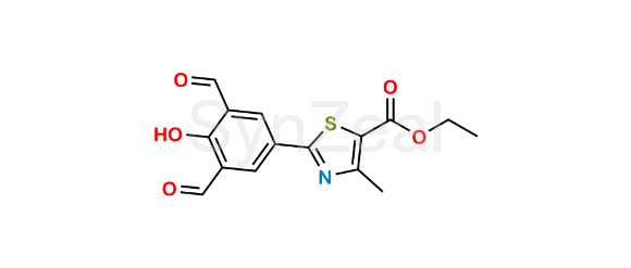 Febuxostat Diformyl Impurity is chemically Ethyl 2-(3,5-diformyl-4-hydroxyphenyl)-4-methylthiazole-5-carboxylate. Febuxostat Diformyl Impurity is supplied with detailed characterization data compliant with regulatory guideline. Febuxostat Diformyl Impurity can be used for the analytical method development, method validation (AMV), Quality Controlled (QC) application for Abbreviated New Drug Application (ANDA) or during commercial production of Febuxostat.