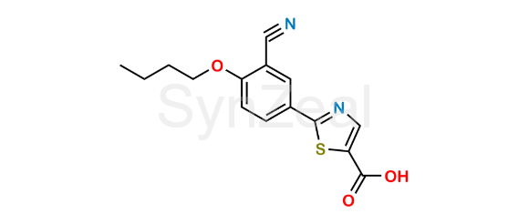 Febuxostat Impurity 15 is chemically 2-(4-Butoxy-3-cyanophenyl)thiazole-5-carboxylic acid. Febuxostat Impurity 15 is supplied with detailed characterization data compliant with regulatory guideline. Febuxostat Impurity 15 can be used for the analytical method development, method validation (AMV), Quality Controlled (QC) application for Abbreviated New Drug Application (ANDA) or during commercial production of Febuxostat.