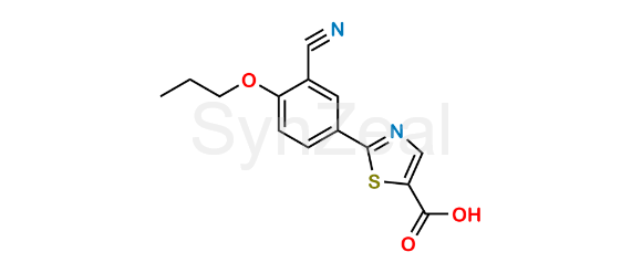 Febuxostat Impurity 17 is chemically 2-(3-Cyano-4-propoxyphenyl)thiazole-5-carboxylic acid. Febuxostat Impurity 17 is supplied with detailed characterization data compliant with regulatory guideline. Febuxostat Impurity 17 can be used for the analytical method development, method validation (AMV), Quality Controlled (QC) application for Abbreviated New Drug Application (ANDA) or during commercial production of Febuxostat.