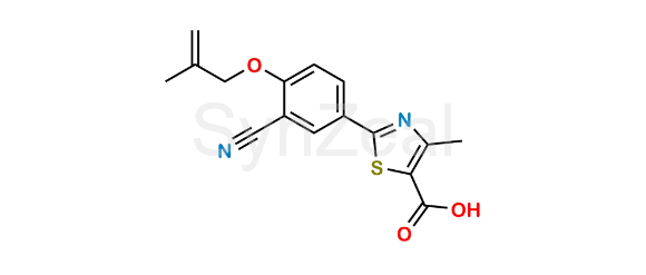Febuxostat Impurity 21 is chemically 2-(3-Cyano-4-((2-methylallyl)oxy)phenyl)-4-methylthiazole-5-carboxylic acid. Febuxostat Impurity 21 is supplied with detailed characterization data compliant with regulatory guideline. Febuxostat Impurity 21 can be used for the analytical method development, method validation (AMV), Quality Controlled (QC) application for Abbreviated New Drug Application (ANDA) or during commercial production of Febuxostat.