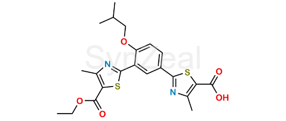 Febuxostat Impurity 23 is chemically 2-(3-(5-(Ethoxycarbonyl)-4-methylthiazol-2-yl)-4-isobutoxyphenyl)-4-methylthiazole-5-carboxylic acid. Febuxostat Impurity 23 is supplied with detailed characterization data compliant with regulatory guideline. Febuxostat Impurity 23 can be used for the analytical method development, method validation (AMV), Quality Controlled (QC) application for Abbreviated New Drug Application (ANDA) or during commercial production of Febuxostat.