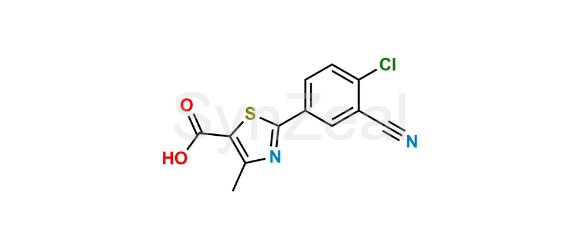 Febuxostat Impurity 29 is chemically 2-(4-Chloro-3-cyanophenyl)-4-methylthiazole-5-carboxylic acid. Febuxostat Impurity 29 is supplied with detailed characterization data compliant with regulatory guideline. Febuxostat Impurity 29 can be used for the analytical method development, method validation (AMV), Quality Controlled (QC) application for Abbreviated New Drug Application (ANDA) or during commercial production of Febuxostat.