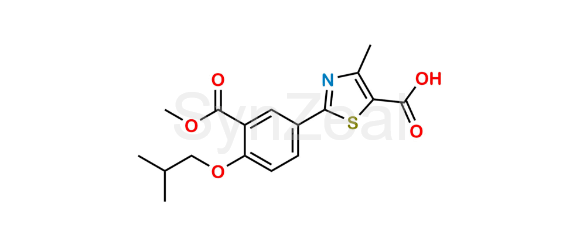 Febuxostat Impurity 38 is chemically 2-(4-Isobutoxy-3-(methoxycarbonyl)phenyl)-4-methylthiazole-5-carboxylic acid. Febuxostat Impurity 38 is supplied with detailed characterization data compliant with regulatory guideline. Febuxostat Impurity 38 can be used for the analytical method development, method validation (AMV), Quality Controlled (QC) application for Abbreviated New Drug Application (ANDA) or during commercial production of Febuxostat.