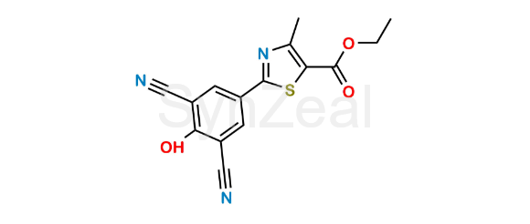 Febuxostat Impurity 48 is chemically Ethyl 2-(3,5-dicyano-4-hydroxyphenyl)-4-methylthiazole-5-carboxylate. Febuxostat Impurity 48 is supplied with detailed characterization data compliant with regulatory guideline. Febuxostat Impurity 48 can be used for the analytical method development, method validation (AMV), Quality Controlled (QC) application for Abbreviated New Drug Application (ANDA) or during commercial production of Febuxostat.