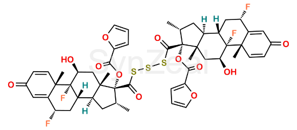 Fluticasone Furoate Trisulphane Impurity is chemically (6S,6'S,8S,8'S,9R,9'R,10S,10'S,11S,11'S,13S,13'S,14S,14'S,16R,16'R,17R,17'R)-(Trisulfanne-1,3-dicarbonyl)bis(6,9-difluoro-11-hydroxy-10,13,16-trimethyl-3-oxo-6,7,8,9,10,11,12,13,14,15,16,17-dodecahydro-3H-cyclopenta[a]phenanthrene-17,17-diyl) bis(furan-2-carboxylate). Fluticasone Furoate Trisulphane Impurity is supplied with detailed characterization data compliant with regulatory guideline. Fluticasone Furoate Trisulphane Impurity can be used for the analytical method development, method validation (AMV), Quality Controlled (QC) application for Abbreviated New Drug Application (ANDA) or during commercial production of Fluticasone.