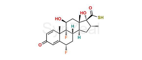 Fluticasone Impurity 8 is chemically (6S,8S,9R,10S,11S,13S,14S,16R,17R)-6,9-Difluoro-11,17-dihydroxy-10,13,16-trimethyl-3-oxo-6,7,8,9,10,11,12,13,14,15,16,17-dodecahydro-3H-cyclopenta[a]phenanthrene-17-carbothioic S-acid. Fluticasone Impurity 8 is supplied with detailed characterization data compliant with regulatory guideline. Fluticasone Impurity 8 can be used for the analytical method development, method validation (AMV), Quality Controlled (QC) application for Abbreviated New Drug Application (ANDA) or during commercial production of Fluticasone.