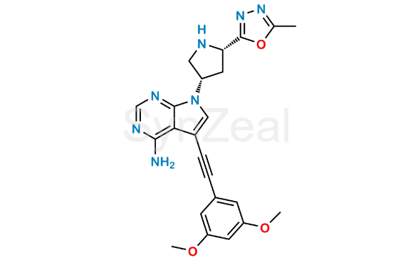 Futibatinib Impurity 8 is chemically 5-((3,5-dimethoxyphenyl)ethynyl)-7-((3S,5S)-5-(5-methyl-1,3,4-oxadiazol-2-yl)pyrrolidin-3-yl)-7H-pyrrolo[2,3-d]pyrimidin-4-amine. Futibatinib Impurity 8 is supplied with detailed characterization data compliant with regulatory guideline. Futibatinib Impurity 8 can be used for the analytical method development, method validation (AMV), Quality Controlled (QC) application for Abbreviated New Drug Application (ANDA) or during commercial production of Futibatinib.