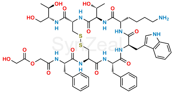 GlycoGlycoyl-Phe1-Octreotide is chemically 2-(((S)-1-(((4S,7R,10S,13R,16S,19R)-13-((1H-indol-3-yl)methyl)-10-(4-aminobutyl)-16-benzyl-4-(((2R,3R)-1,3-dihydroxybutan-2-yl)carbamoyl)-7-((R)-1-hydroxyethyl)-6,9,12,15,18-pentaoxo-1,2-dithia-5,8,11,14,17-pentaazacycloicosan-19-yl)amino)-1-oxo-3-phenylpropan-2-yl)amino)-2-oxoethyl 2-hydroxyacetate. GlycoGlycoyl-Phe1-Octreotide is supplied with detailed characterization data compliant with regulatory guideline. GlycoGlycoyl-Phe1-Octreotide can be used for the analytical method development, method validation (AMV), Quality Controlled (QC) application for Abbreviated New Drug Application (ANDA) or during commercial production of Octreotide.