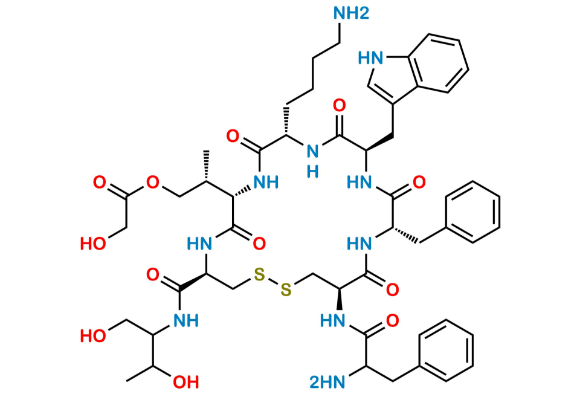 Glycoyl Thr(6) Octreotide is chemically (2R)-2-((4R,7S,10S,13R,16S,19R)-13-((1H-indol-3-yl)methyl)-19-(2-amino-3-phenylpropanamido)-10-(4-aminobutyl)-16-benzyl-4-((1,3-dihydroxybutan-2-yl)carbamoyl)-6,9,12,15,18-pentaoxo-1,2-dithia-5,8,11,14,17-pentaazacycloicosan-7-yl)propyl 2-hydroxyacetate. Glycoyl Thr(6) Octreotide is supplied with detailed characterization data compliant with regulatory guideline. Glycoyl Thr(6) Octreotide can be used for the analytical method development, method validation (AMV), Quality Controlled (QC) application for Abbreviated New Drug Application (ANDA) or during commercial production of Octreotide.