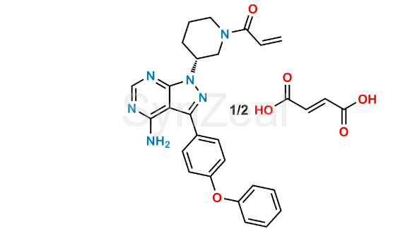Ibrutinib Hemifumarate is chemically (R)-1-(3-(4-Amino-3-(4-phenoxyphenyl)-1H-pyrazolo[3,4-d]pyrimidin-1-yl)piperidin-1-yl)prop-2-en-1-one hemifumarate. It is also known as Ibrutinib R-Isomer. Ibrutinib Hemifumarate is supplied with detailed characterization data compliant with regulatory guideline. Ibrutinib Hemifumarate can be used for the analytical method development, method validation (AMV), Quality Controlled (QC) application for Abbreviated New Drug Application (ANDA) or during commercial production of Ibrutinib.