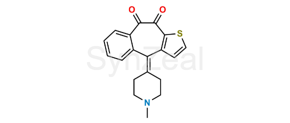 Ketotifen Fumarate EP Impurity G is chemically 4-(1-Methylpiperidin-4-ylidene)-4H-benzo[4,5]cyclohepta[1,2-b]thiophen-9,10-dione (as per EP) ; (4-(1-Methylpiperidin-4-ylidene)-4H-benzo[4,5]cyclohepta[1,2-b]thiophene-9,10-dione fumarate) (as per USP). It is also known as Ketotifen USP Related Compound G ; 9,10-Dioxo Ketotifen. Ketotifen Fumarate EP Impurity G is supplied with detailed characterization data compliant with regulatory guideline. Ketotifen Fumarate EP Impurity G can be used for the analytical method development, method validation (AMV), Quality Controlled (QC) application for Abbreviated New Drug Application (ANDA) or during commercial production of Ketotifen Fumarate.