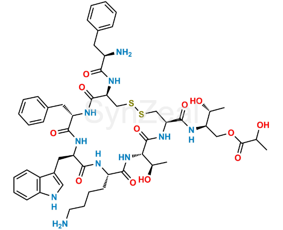 Lactyl-Threoninyl Octreotide is chemically (2R,3R)-2-((4R,7S,10S,13R,16S,19R)-13-((1H-indol-3-yl)methyl)-19-((R)-2-amino-3-phenylpropanamido)-10-(4-aminobutyl)-16-benzyl-7-((R)-1-hydroxyethyl)-6,9,12,15,18-pentaoxo-1,2-dithia-5,8,11,14,17-pentaazacycloicosane-4-carboxamido)-3-hydroxybutyl 2-hydroxypropanoate. Lactyl-Threoninyl Octreotide is supplied with detailed characterization data compliant with regulatory guideline. Lactyl-Threoninyl Octreotide can be used for the analytical method development, method validation (AMV), Quality Controlled (QC) application for Abbreviated New Drug Application (ANDA) or during commercial production of Octreotide.