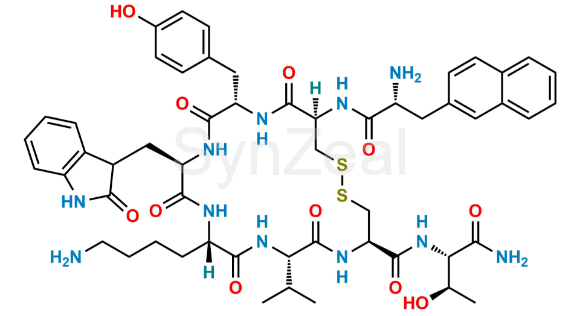 Lanreotide Impurity 3 is chemically (4R,7S,10S,13R,16S,19R)-19-((R)-2-Amino-3-(naphthalen-2-yl)propanamido)-N-((2S,3R)-1-amino-3-hydroxy-1-oxobutan-2-yl)-10-(4-aminobutyl)-16-(4-hydroxybenzyl)-7-isopropyl-6,9,12,15,18-pentaoxo-13-((2-oxoindolin-3-yl)methyl)-1,2-dithia-5,8,11,14,17-pentaazacycloicosane-4-carboxamide. Lanreotide Impurity 3 is supplied with detailed characterization data compliant with regulatory guideline. Lanreotide Impurity 3 can be used for the analytical method development, method validation (AMV), Quality Controlled (QC) application for Abbreviated New Drug Application (ANDA) or during commercial production of Lanreotide.