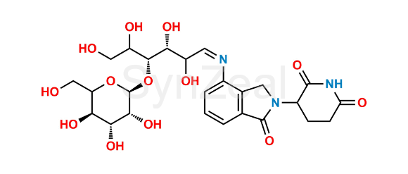 Lenalidomide Impurity 37 is chemically 3-(1-oxo-4-(((3R,4R,Z)-2,3,5,6-tetrahydroxy-4-(((2S,3R,4R,5R)-3,4,5-trihydroxy-6-(hydroxymethyl)tetrahydro-2H-pyran-2-yl)oxy)hexylidene)amino)isoindolin-2-yl)piperidine-2,6-dione. Lenalidomide Impurity 37 is supplied with detailed characterization data compliant with regulatory guideline. Lenalidomide Impurity 37 can be used for the analytical method development, method validation (AMV), Quality Controlled (QC) application for Abbreviated New Drug Application (ANDA) or during commercial production of Lenalidomide.
