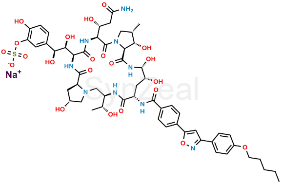 化学名称: Sodium 5-((1S,2S)-2-((2R,6R,9S,11R,12R,14aS,15S,16S,20S,23S,25aS)-20-((R)-3-amino-1-hydroxy-3-oxopropyl)-2,11,12,15-tetrahydroxy-6-((R)-1-hydroxyethyl)-16-methyl-8,14,19,22,25-pentaoxo-9-(4-(3-(4-(pentyloxy)phenyl)isoxazol-5-yl)benzamido)tetracosahydro-1H-dipyrrolo[2,1-c:2',1'-l][1,4,7,10,13,16]hexaazacyclohenicosin-23-yl)-1,2-dihydroxyethyl)-2-hydroxyphenyl sulfate