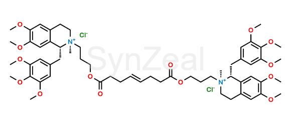 Mivacurium Impurity 8 is chemically (1R,1'R,2S,2'S)-2,2'-((((E)-Oct-4-enedioyl)bis(oxy))bis(propane-3,1-diyl))bis(6,7-dimethoxy-2-methyl-1-(3,4,5-trimethoxybenzyl)-1,2,3,4-tetrahydroisoquinolin-2-ium) chloride. Mivacurium Impurity 8 is supplied with detailed characterization data compliant with regulatory guideline. Mivacurium Impurity 8 can be used for the analytical method development, method validation (AMV), Quality Controlled (QC) application for Abbreviated New Drug Application (ANDA) or during commercial production of Mivacurium.