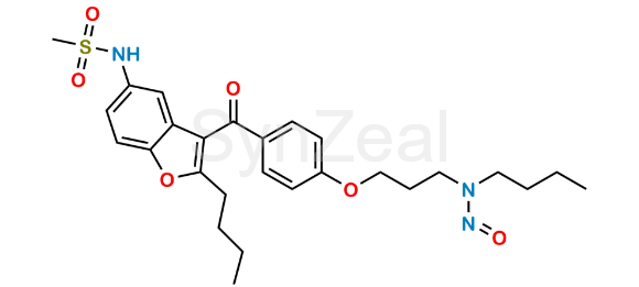 N-Nitroso Dronedarone EP Impurity A is chemically N-(2-Butyl-3-(4-(3-(butyl(nitroso)amino)propoxy)benzoyl)benzofuran-5-yl)methanesulfonamide. It is also known as N-Nitroso Dronedarone USP Related Compound A ; Dronedarone Desbutyl Nitroso Impurity. N-Nitroso Dronedarone EP Impurity A is supplied with detailed characterization data compliant with regulatory guideline. N-Nitroso Dronedarone EP Impurity A can be used for the analytical method development, method validation (AMV), Quality Controlled (QC) application for Abbreviated New Drug Application (ANDA) or during commercial production of Dronedarone Hydrochloride.