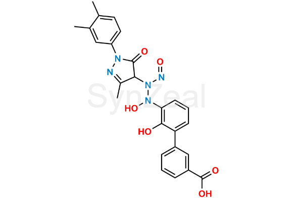 N Nitroso Eltrombopag N-Oxide is chemically 3'-(2-(1-(3,4-Dimethylphenyl)-3-methyl-5-oxo-4,5-dihydro-1H-pyrazol-4-yl)-1-hydroxy-2-nitrosohydrazinyl)-2'-hydroxy-[1,1'-biphenyl]-3-carboxylic acid. N Nitroso Eltrombopag N-Oxide is supplied with detailed characterization data compliant with regulatory guideline. N Nitroso Eltrombopag N-Oxide can be used for the analytical method development, method validation (AMV), Quality Controlled (QC) application for Abbreviated New Drug Application (ANDA) or during commercial production of Eltrombopag.