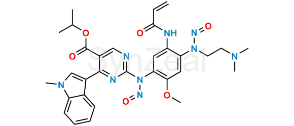 N-Nitroso Mobocertinib Impurity 2 is chemically Isopropyl 2-((5-acrylamido-4-((2-(dimethylamino)ethyl)(nitroso)amino)-2-methoxyphenyl)(nitroso)amino)-4-(1-methyl-1H-indol-3-yl)pyrimidine-5-carboxylate. N-Nitroso Mobocertinib Impurity 2 is supplied with detailed characterization data compliant with regulatory guideline. N-Nitroso Mobocertinib Impurity 2 can be used for the analytical method development, method validation (AMV), Quality Controlled (QC) application for Abbreviated New Drug Application (ANDA) or during commercial production of Mobocertinib.