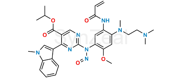 N-Nitroso Mobocertinib Impurity 3 is chemically Isopropyl 2-((5-acrylamido-4-((2-(dimethylamino)ethyl)(methyl)amino)-2-methoxyphenyl)(nitroso)amino)-4-(1-methyl-1H-indol-3-yl)pyrimidine-5-carboxylate. N-Nitroso Mobocertinib Impurity 3 is supplied with detailed characterization data compliant with regulatory guideline. N-Nitroso Mobocertinib Impurity 3 can be used for the analytical method development, method validation (AMV), Quality Controlled (QC) application for Abbreviated New Drug Application (ANDA) or during commercial production of Mobocertinib.