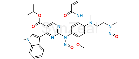 N-Nitroso Mobocertinib Impurity 5 is chemically Isopropyl 2-((5-acrylamido-2-methoxy-4-(methyl(2-(methyl(nitroso)amino)ethyl)amino)phenyl)(nitroso)amino)-4-(1-methyl-1H-indol-3-yl)pyrimidine-5-carboxylate. N-Nitroso Mobocertinib Impurity 5 is supplied with detailed characterization data compliant with regulatory guideline. N-Nitroso Mobocertinib Impurity 5 can be used for the analytical method development, method validation (AMV), Quality Controlled (QC) application for Abbreviated New Drug Application (ANDA) or during commercial production of Mobocertinib.