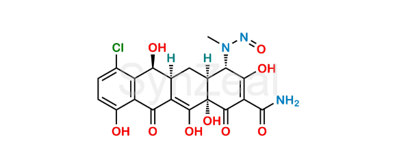 N-Nitroso N-Desmethyl Demeclocycline is chemically (4S,4aS,5aS,6S,12aS)-7-chloro-3,6,10,12,12a-pentahydroxy-4-(methyl(nitroso)amino)-1,11-dioxo-1,4,4a,5,5a,6,11,12a-octahydrotetracene-2-carboxamide. N-Nitroso N-Desmethyl Demeclocycline is supplied with detailed characterization data compliant with regulatory guideline. N-Nitroso N-Desmethyl Demeclocycline can be used for the analytical method development, method validation (AMV), Quality Controlled (QC) application for Abbreviated New Drug Application (ANDA) or during commercial production of Demeclocycline.