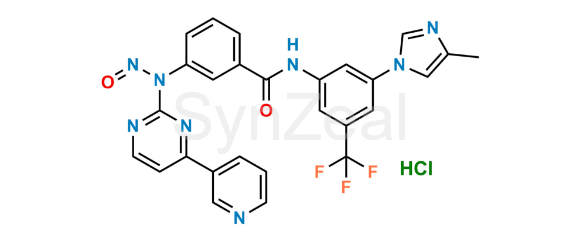 N-Nitroso Nilotinib EP Impurity E is chemically N-(3-(4-Methyl-1H-imidazol-1-yl)-5-(trifluoromethyl)phenyl)-3-(nitroso(4-(pyridin-3-yl)pyrimidin-2-yl)amino)benzamide hydrochloride. N-Nitroso Nilotinib EP Impurity E is supplied with detailed characterization data compliant with regulatory guideline. N-Nitroso Nilotinib EP Impurity E can be used for the analytical method development, method validation (AMV), Quality Controlled (QC) application for Abbreviated New Drug Application (ANDA) or during commercial production of Nilotinib.