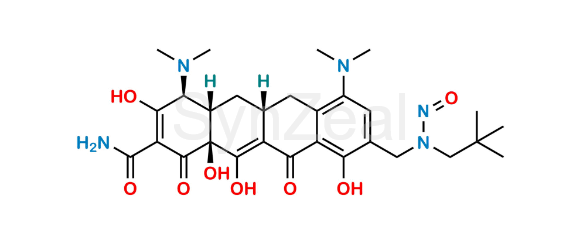 N-Nitroso Omadacycline is chemically (4S,4aS,5aR,12aS)-4,7-bis(dimethylamino)-3,10,12,12a-tetrahydroxy-9-((neopentyl(nitroso)amino)methyl)-1,11-dioxo-1,4,4a,5,5a,6,11,12a-octahydrotetracene-2-carboxamide. N-Nitroso Omadacycline is supplied with detailed characterization data compliant with regulatory guideline. N-Nitroso Omadacycline can be used for the analytical method development, method validation (AMV), Quality Controlled (QC) application for Abbreviated New Drug Application (ANDA) or during commercial production of Omadacycline.