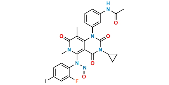 N-Nitroso Trametinib is chemically N-(3-(3-Cyclopropyl-5-((2-fluoro-4-iodophenyl)(nitroso)amino)-6,8-dimethyl-2,4,7-trioxo-3,4,6,7-tetrahydropyrido[4,3-d]pyrimidin-1(2H)-yl)phenyl)acetamide. N-Nitroso Trametinib is supplied with detailed characterization data compliant with regulatory guideline. N-Nitroso Trametinib can be used for the analytical method development, method validation (AMV), Quality Controlled (QC) application for Abbreviated New Drug Application (ANDA) or during commercial production of Trametinib.