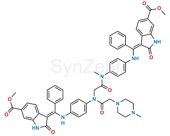 Nintedanib Impurity 49 is chemically Methyl (Z)-3-(((4-(N-(2-((4-((((Z)-6-(methoxycarbonyl)-2-oxoindolin-3-ylidene)(phenyl)methyl)amino)phenyl)(methyl)amino)-2-oxoethyl)-2-(4-methylpiperazin-1-yl)acetamido)phenyl)amino)(phenyl)methylene)-2-oxoindoline-6-carboxylate. Nintedanib Impurity 49 is supplied with detailed characterization data compliant with regulatory guideline. Nintedanib Impurity 49 can be used for the analytical method development, method validation (AMV), Quality Controlled (QC) application for Abbreviated New Drug Application (ANDA) or during commercial production of Nintedanib.