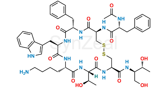 Octreotide EP Impurity I is chemically N2.1-Acetyloctreotide (as per EP) ; N-Acetyl-D-phenylalanyl-L-cysteinyl-L-phenylalanyl-D-tryptophyl-L-lysyl-L-threonyl-N-[(1R,2R)-2-hydroxy-1-(hydroxymethyl)propyl]-L-cysteinamide cyclic (2-->7)-disulfide (as per USP). It is also known as [Phe(Ac)]1-Octreotide (USP). Octreotide EP Impurity I is supplied with detailed characterization data compliant with regulatory guideline. Octreotide EP Impurity I can be used for the analytical method development, method validation (AMV), Quality Controlled (QC) application for Abbreviated New Drug Application (ANDA) or during commercial production of Octreotide.