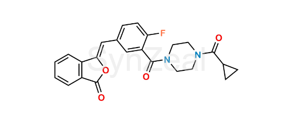 Olaparib Impurity 15 (Z-Isomer) is chemically (Z)-3-(3-(4-(Cyclopropanecarbonyl)piperazine-1-carbonyl)-4-fluorobenzylidene)isobenzofuran-1(3H)-one. Olaparib Impurity 15 (Z-Isomer) is supplied with detailed characterization data compliant with regulatory guideline. Olaparib Impurity 15 (Z-Isomer) can be used for the analytical method development, method validation (AMV), Quality Controlled (QC) application for Abbreviated New Drug Application (ANDA) or during commercial production of Olaparib.