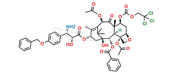 Paclitaxel Impurity 34 is chemically (2aR,4S,4aS,6R,9S,11S,12S,12aR,12bS)-9-(((2R,3S)-3-amino-3-(4-(benzyloxy)phenyl)-2-hydroxypropanoyl)oxy)-12-(benzoyloxy)-11-hydroxy-4a,8,13,13-tetramethyl-5-oxo-4-(((2,2,2-trichloroethoxy)carbonyl)oxy)-3,4,4a,5,6,9,10,11,12,12a-decahydro-1H-7,11-methanocyclodeca[3,4]benzo[1,2-b]oxete-6,12b(2aH)-diyl diacetate. It is also known as N-Debenzoyl-3’-P-O-Benzy-7-{[(2,2,2,-Trichloroethyl)oxy]carbonyl} Paclitaxel. Paclitaxel Impurity 34 is supplied with detailed characterization data compliant with regulatory guideline. Paclitaxel Impurity 34 can be used for the analytical method development, method validation (AMV), Quality Controlled (QC) application for Abbreviated New Drug Application (ANDA) or during commercial production of Paclitaxel.