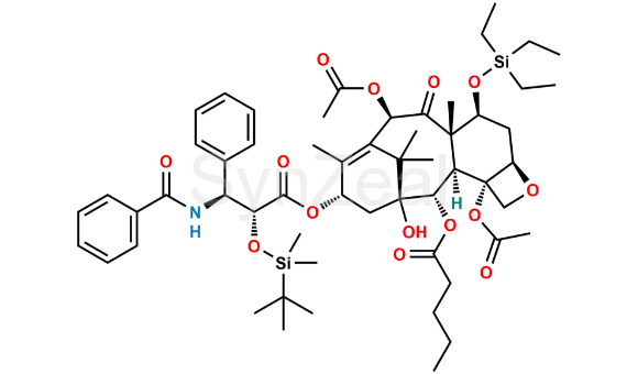 Paclitaxel Impurity 44 is chemically (αR,βS)-β-(Benzoylamino)-α-tert-butyl(dimethyl)silyloxy-benzenepropanoic Acid (2aR,4S,4aS,6R,9S,11S,12S,12aR,12bS)-6,12b-Bis(acetyloxy)-2a,3,4,4a,5,6,9,10,11,12,12a,12b-dodecahydro-4-triethylsilyloxy-11-hydroxy-4a,8,13,13-tetramethyl-5-oxo-12-[(1-oxopentyl)oxy]-7,11-methano-1H-cyclodeca[3,4]benz[1,2-b]oxet-9-yl ester; (2aR,4S,4aS,6R,9S,11S,12S,12aR,12bS)-9-(((2R,3R)-3-benzamido-2-((tert-butyldimethylsilyl)oxy)-3-phenylpropanoyl)oxy)-11-hydroxy-4a,8,13,13-tetramethyl-5-oxo-12-(pentanoyloxy)-4-((triethylsilyl)oxy)-3,4,4a,5,6,9,10,11,12,12a-decahydro-1H-7,11-methanocyclodeca[3,4]benzo[1,2-b]oxete-6,12b(2aH)-diyl diacetate. It is also known as 7-O-(Triethylsilyl)-2’-O-Tert-Butyl(dimethyl)silyl 2-Debenzoyl Paclitaxel 2-Pentanoate. Paclitaxel Impurity 44 is supplied with detailed characterization data compliant with regulatory guideline. Paclitaxel Impurity 44 can be used for the analytical method development, method validation (AMV), Quality Controlled (QC) application for Abbreviated New Drug Application (ANDA) or during commercial production of Paclitaxel.