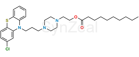 Perphenazine Decanoate is chemically 2-(4-(3-(2-Chloro-10H-phenothiazin-10-yl)propyl)piperazin-1-yl)ethyl decanoate. Perphenazine Decanoate is supplied with detailed characterization data compliant with regulatory guideline. Perphenazine Decanoate can be used for the analytical method development, method validation (AMV), Quality Controlled (QC) application for Abbreviated New Drug Application (ANDA) or during commercial production of Perphenazine.